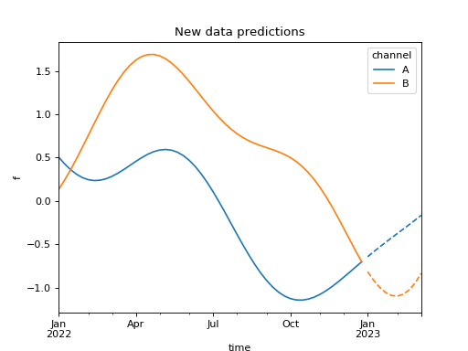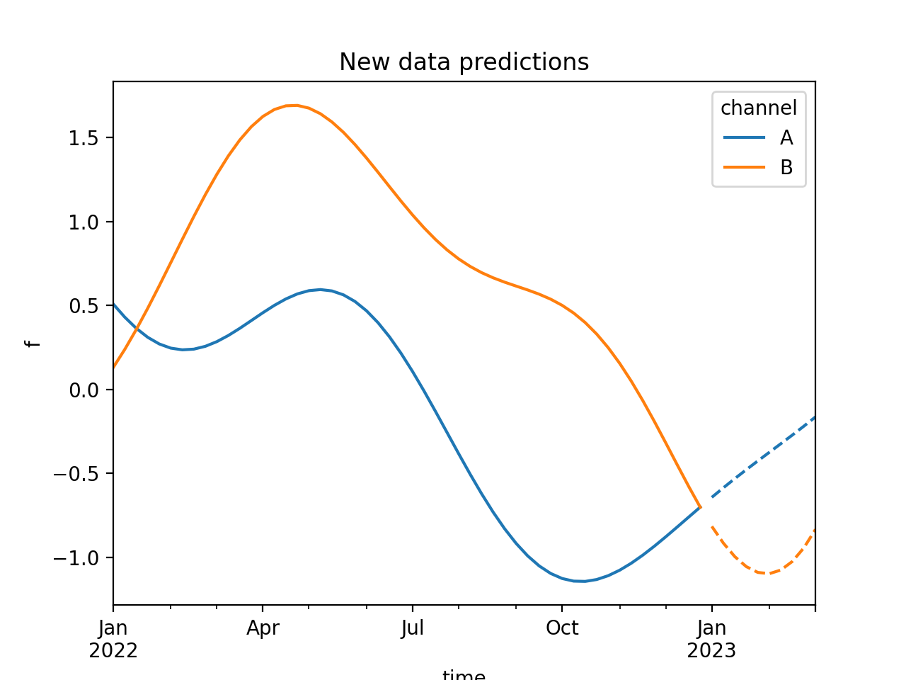 ax.set(xlabel="time", ylabel="f", title="New data predictions")
